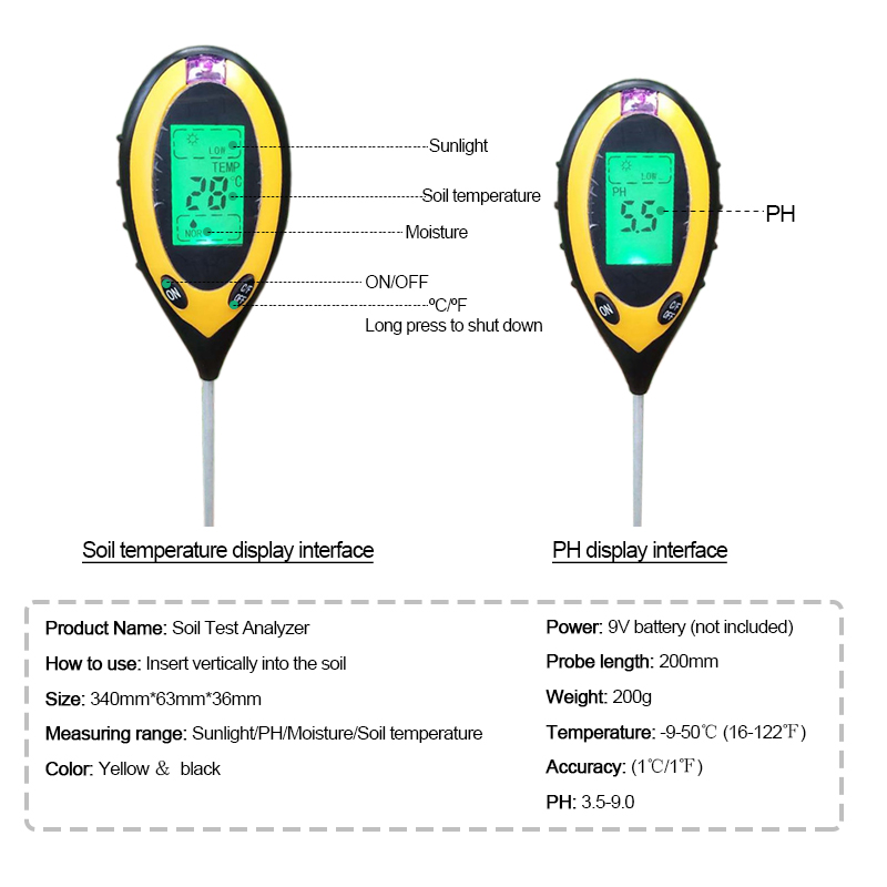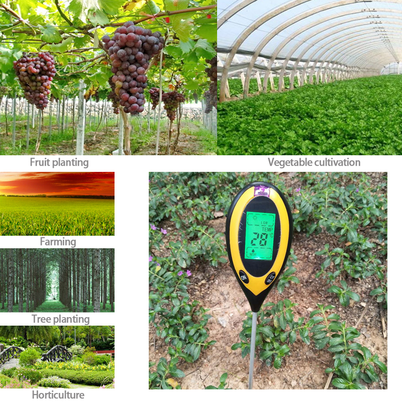 Probador de nutrientes del suelo LCD, medidor de PH del suelo, medidor de humedad temperatura luz solar, medición de intensidad acidez del suelo agrícola